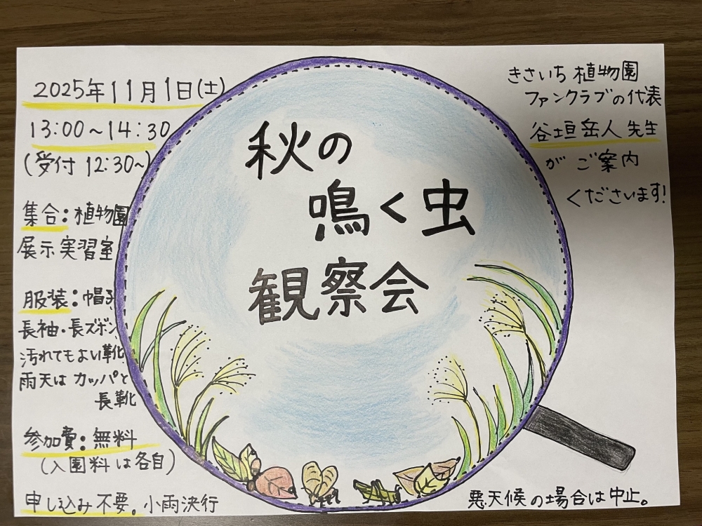 日時 : 11月1日(土) 13:00-14:30(12:30より受付)集合 : 大阪公立大学附属植物園 展示実習室講師 : 谷垣岳人氏(きさいち植物園ファンクラブ代表)服装 : 帽子、長袖・長ズボン…