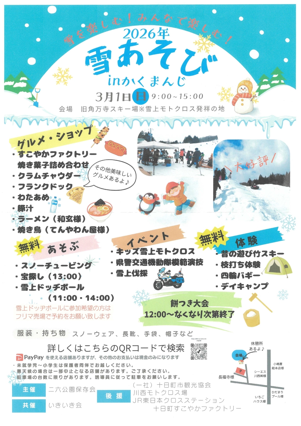 雪を楽しむ!みんなで楽しむ! in かくまんじ開催日時:2026年3月1日(日)9:00~15:00会 場:旧角万寺スキー場 ※雪上モトクロス発祥の地