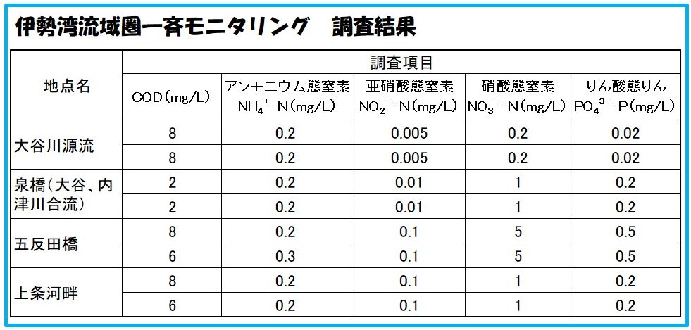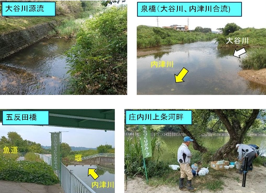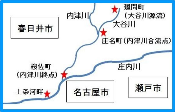 みどりのまちづくりグループは平成16年以来、水質調査(簡易水質テスト)を実施し、平成21年からは国交省伊勢湾再生推進会議の「伊勢湾流域圏一斉モニタリング」に参加しています。測定点は次の4か所です。①大谷川源流 ②泉橋(大谷川、内津川合流) ③五反田橋 ④庄内川上条河畔。
