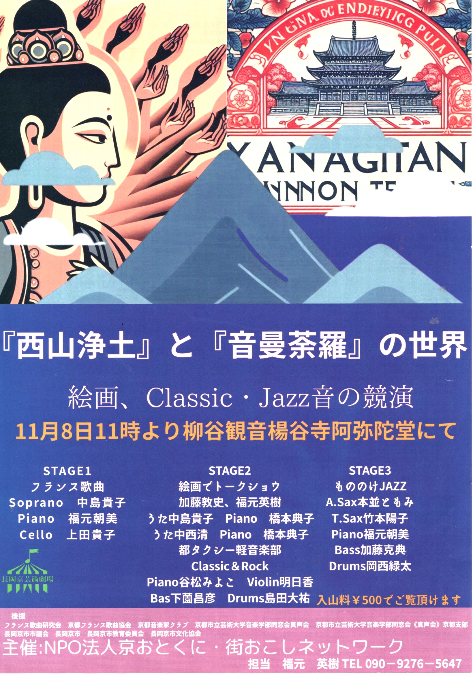 この企画では、乙訓地域を西山という山並みを神聖な山並みとして捉え、このことを「西山浄土」と表記したうえで「絵曼荼羅」・「文字曼荼羅」だけでなく、新たに「音曼荼羅」という概念を打ち立てて、阿弥陀仏を背景に繰り広げられる舞台を構成することができました。