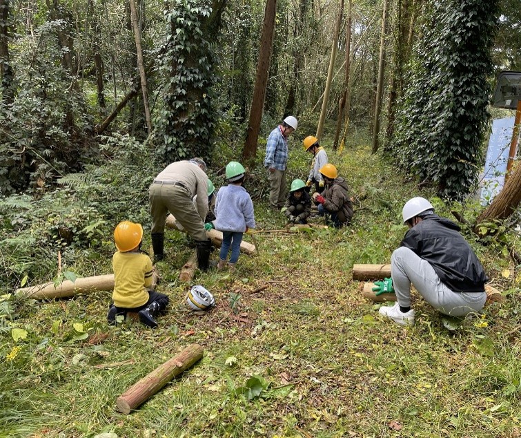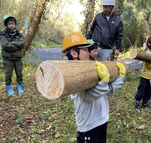10:45 玉切した丸太を、鍋敷きやコースターにのこぎりで切って加工する。指導者がチェンソーでスウェーデントーチに加工した。玉切した丸太をみんなで持てることを確認。天然乾燥して水分量が減り重量が1/3になっており、こどもでも持ち上げることができた。軽トラックに運搬した。