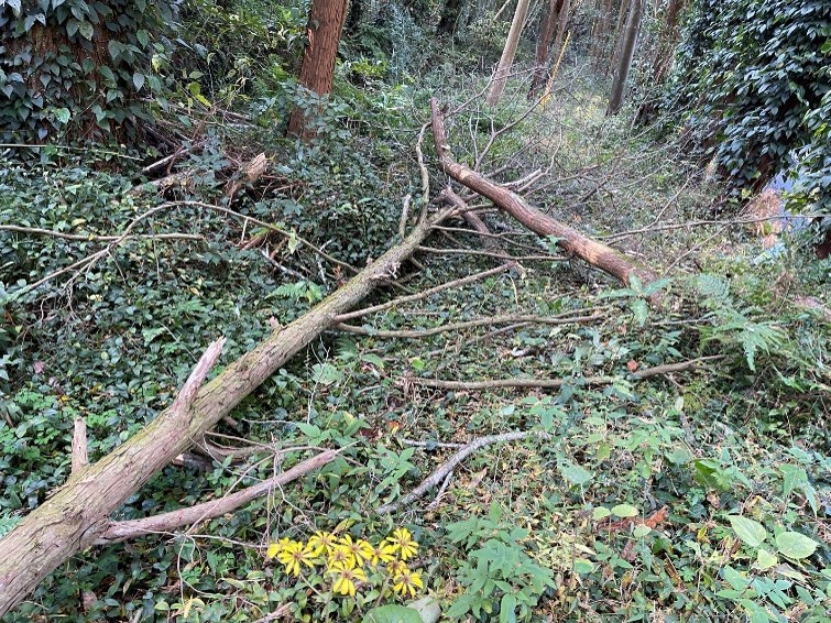 ↑伐倒したヒノキ。石蕗の花。