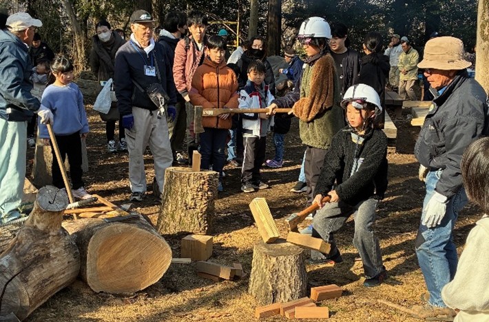 一度には出来ないので合間に里山会員の指導を得て斧を使っての薪割りを体験、