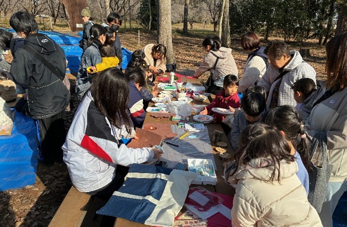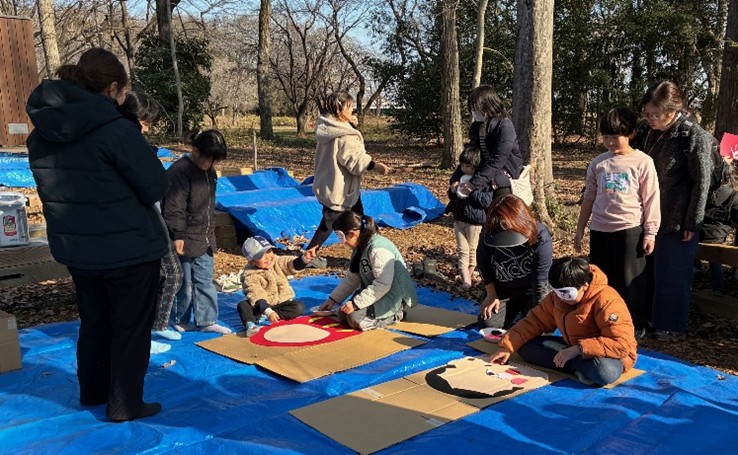 またクラフトコーナーで各自自由に作品をつくり、福笑いコーナーで思い通りに纏まらなくても楽しんでいた。子ども達は待ち時間も無駄なく再度落ち葉さらいをしたり森遊びをしたりと森の中を動き回っていて、見ているだけでも楽しくなります。こういう安全な自然の中だから子ども達ものびのび動き回れるのだと思います。樹々や草花に囲まれておいしい空気を味わいながら里山の保全活動をしているから味わえる醍醐味です。