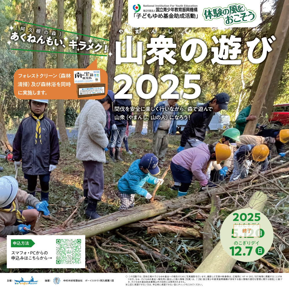 海衆山衆の遊び2025秋冬~山衆の遊び2025 参加者募集中!①2024年5月に皮むきした天然乾燥したヒノキを伐採し、玉切し枝葉をノコギリで伐る。②フォレストクリーン(森林清掃)及び森林浴を行う。③玉…