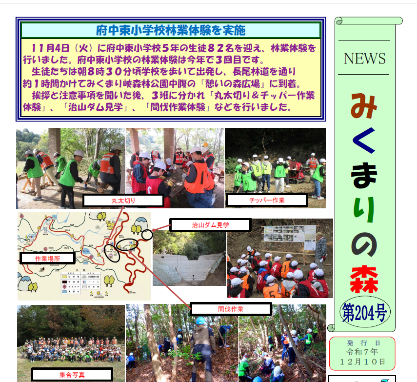 今月号は、府中東小学校の林業体験の様子や、定期活動の報告などが掲載されています。