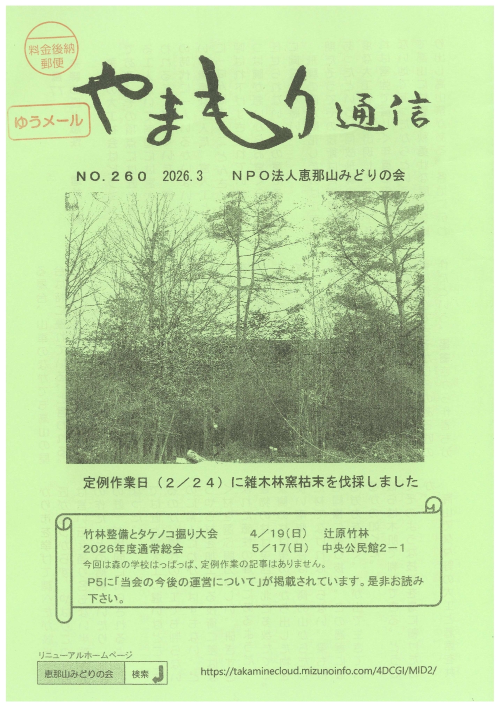 やまもり通信№260のおしらせです。森の風、森づくりだよりを掲載しています。・竹林整備とタケノコ掘り大会開催のお知らせ(4/19)