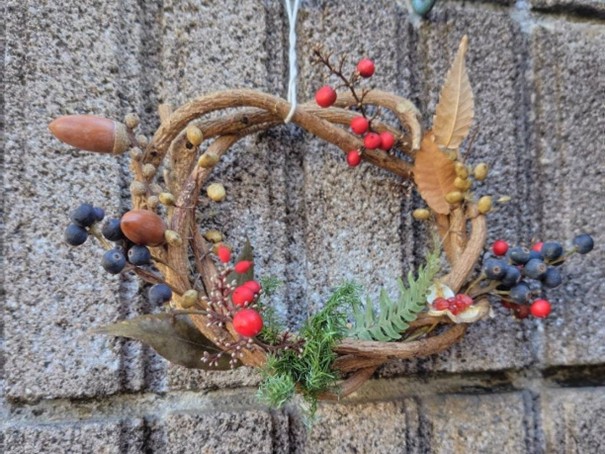 クリスマスリースはフジやアケビ、クズなどのつるをベースに、きれいな木の実を見つけてはくっつけたりして、落ち葉やスギの葉なんかも飾っていくので温かみのあるものができあがります。