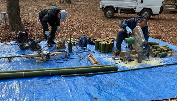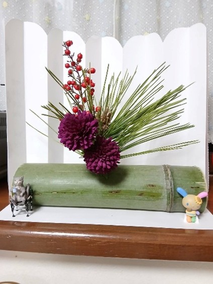 12月27日(土)里山に親子が集まり皆で門松作りを行ないました。当日は材料にする竹の切断を手伝ったり、昼食用の竈や炭を用意したりしましたが、終了後に自分用の門松を作ってみました。里山会員の勧めもあり投稿しました。