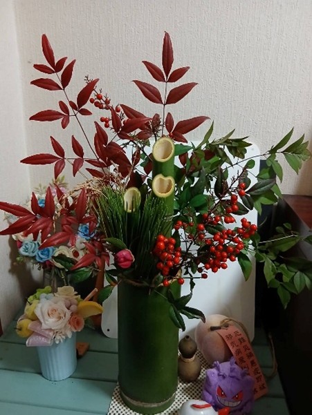 左:我が家の自作正月飾り 竹の切り口の一つがハートの形になりました